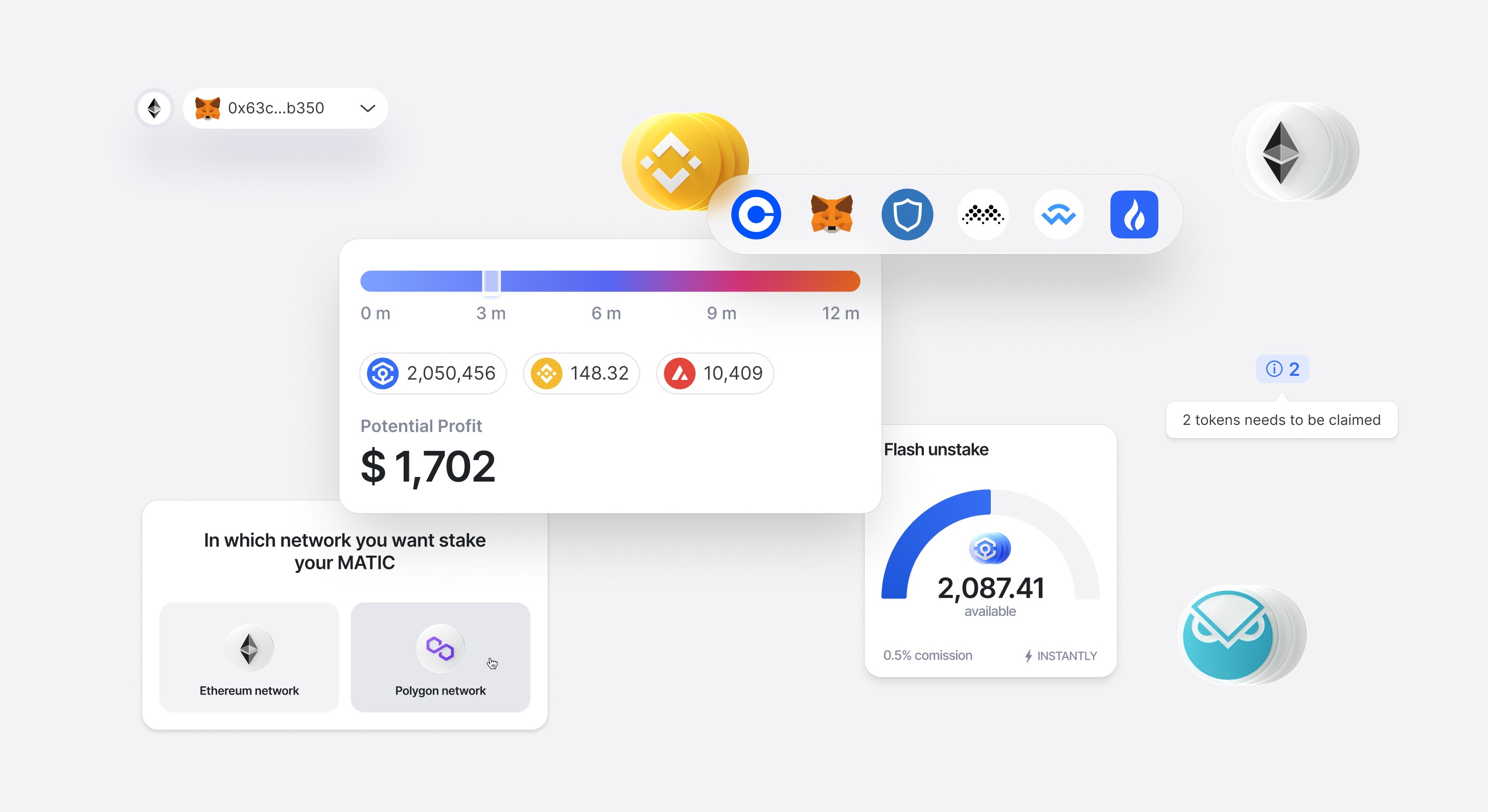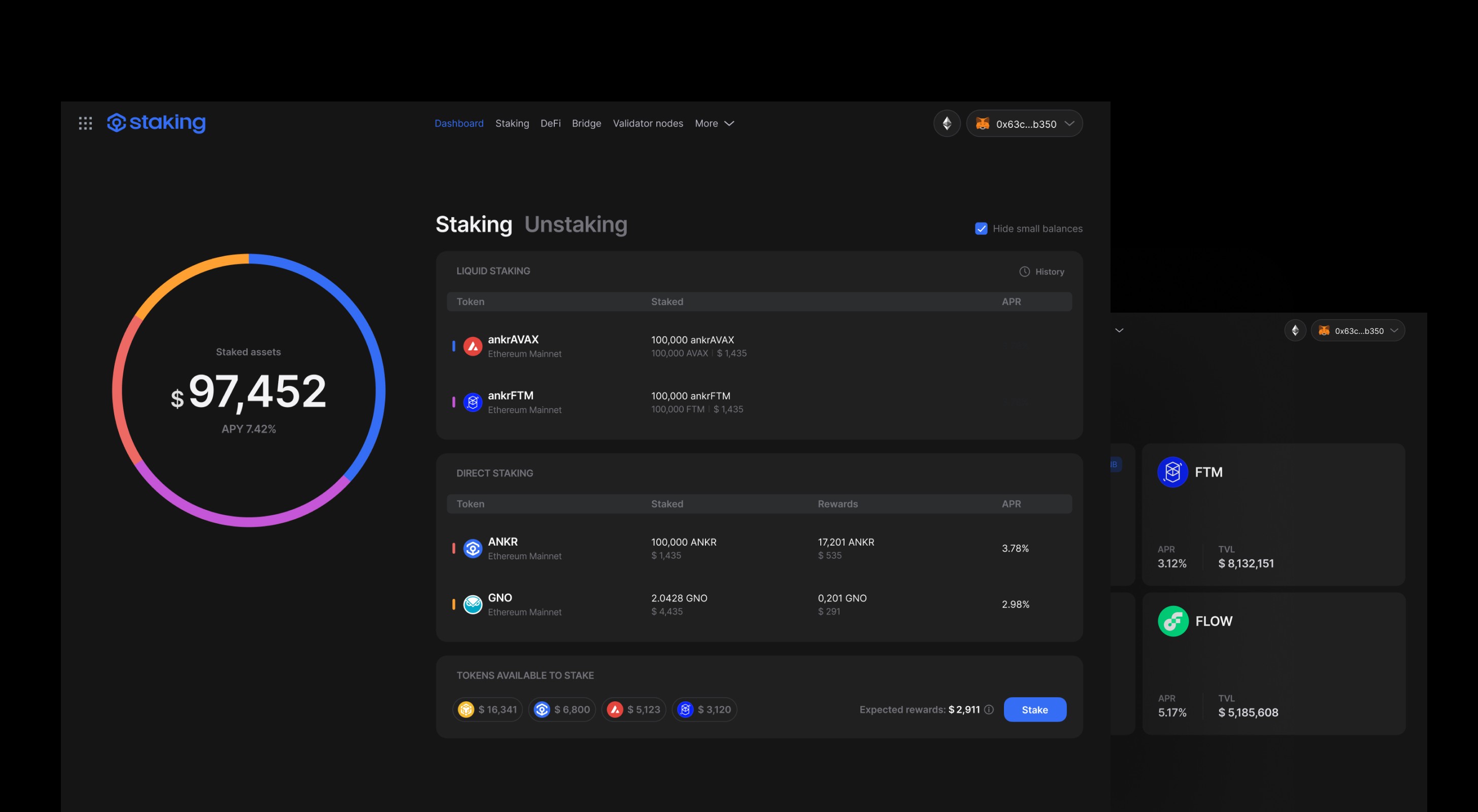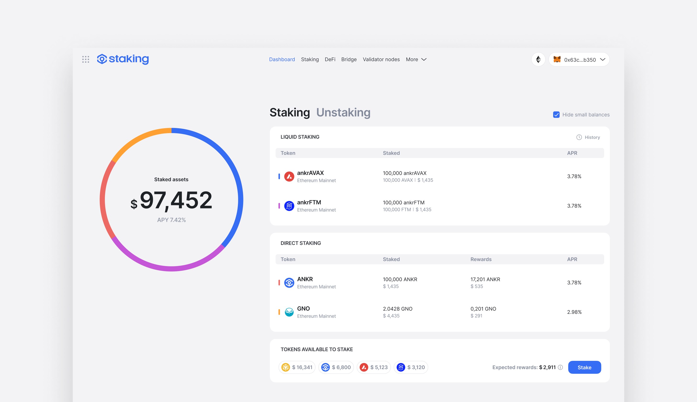 The main page of the platform is a dashboard where a user is able to see all their staked assets; pie chart helps find assets’ allocations quickly. Moreover the user sees potential income they could receive while staking other assets