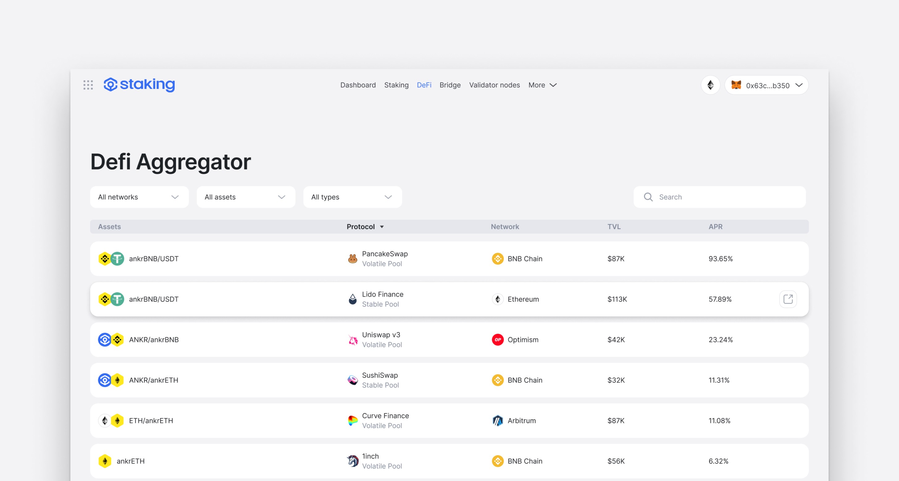 The Defi Aggregator page allows users to apply their staked tokens on the other platforms to receive maximum yield